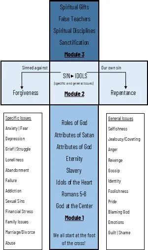 In biblical counseling and discipleship relationships, our aim is to guide others toward the foot of the cross as we address our struggles and issues in light of theology. The Hub Resource equips us with the knowledge of the Word and helps us share its truth with those we influence, whether through a formal biblical-counseling relationship, intentional discipleship, or our daily interactions. As we work our way up the cross, through Module 1, we acknowledge the sovereignty of God as we bring our will into alignment with His. We understand sin and Satan cause chaos in our lives leading to various idols that enslave us and keep us from an abundant life. In Module 2, the horizontal portion of the cross, we admit that our own sin requires repentance while being sinned against requires forgiveness, both which require the tremendous grace and mercy of God. Once our minds are renewed, and we are freed from the bondage of our past, in Module 3 we explore true sanctification, devotion, and service as we live lives of worship and holiness before the Lord. Having weaved all of the idols of the heart into a thorough system of theology, we can now experience the real and lasting hope and healing for which we all long.