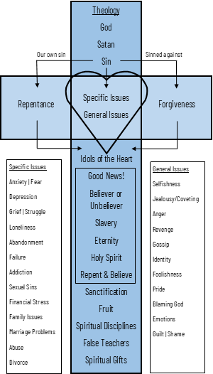 As represented in this picture of the cross, in order to find hope and healing, we will be helping our counselees identify the sin in their own life that requires repentance, and the possible need to ask others that they have harmed for forgiveness. We will also be helping our counselees identify, from their past, those who have sinned against them that they need to work to extend forgiveness. See Repentance | Forgiveness for more on this.